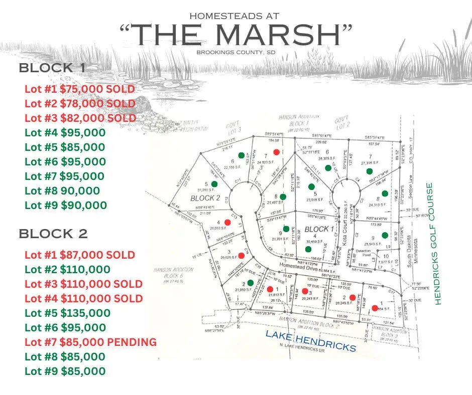 Check out these lots located at the newest development near Lake Hendricks, THE MARSH! Great location just across the road to the west of the Hendricks Golf Club, and just to the north of the lake. Association fee was recently set at $200 per year. Call today to claim one of the last available lots on the South Dakota side of Lake Hendricks!